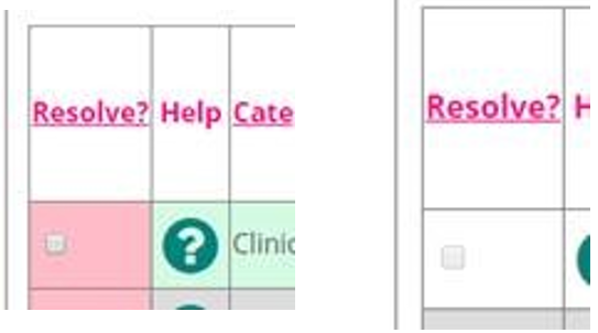 Users can easily determine whether or not any particular alert can be resolved by the color-coded shading of the Resolve? column for the corresponding alert. As shown below, the Resolve? column will display pink shading for alerts that can be manually resolved and white for alerts that cannot.