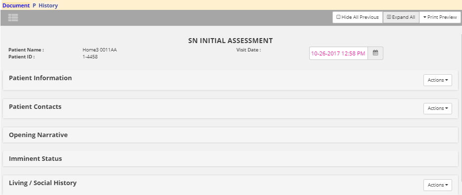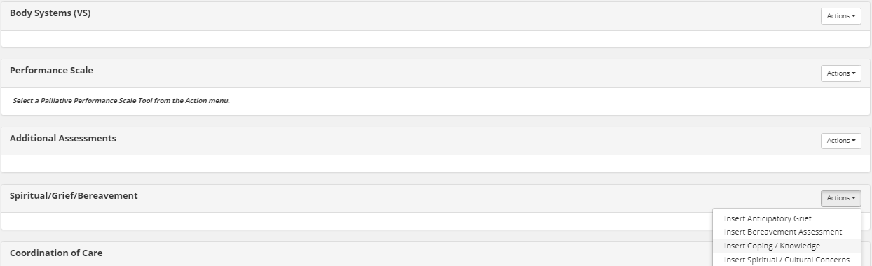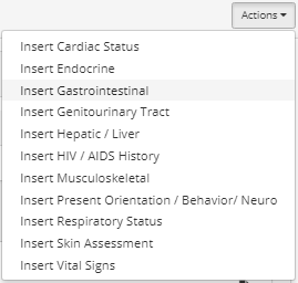 Some instances of the Actions field allow users to insert additional sections of the document that may be necessary for the patient assessment (e.g. Living / Social History, Brief Pain History, Endocrine, Vital Signs, ADL/IADLs, etc.). Depending on the type of document, users can insert numerous different sections of data into the document. The available options are unique to each instance of the Actions drop-down field.