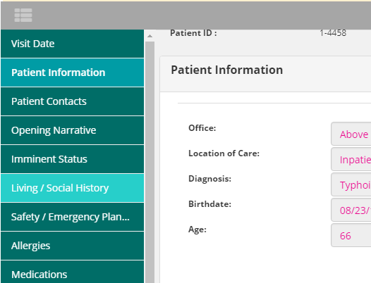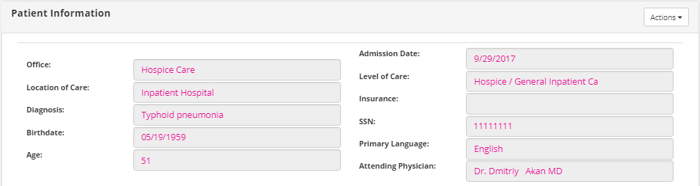 To ease the process of entering data (especially common patient details), existing information automatically populates in the corresponding fields (e.g. Patient Name, Birthdate, Diagnosis, Allergies, Patient Contacts, etc.) from the patient chart, when applicable. Patient data that synchronizes from the patient chart is indicated by pink text. This can be specific text that was entered in the patient chart, but may also include selections that have been made in certain checkbox, radio button, or drop-down fields. As shown in the sample below, the Patient Information section contains several fields often populated from information in the patient chart.