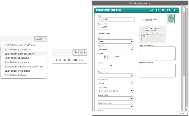 When an option is selected, a smaller window will display the corresponding screen of the software. The sample image above shows what happens when a user selects the Edit Patient Demographics option from the Actions menu located in the Patient Information section; the Edit Patient Demographics window displays in front of the document (which is a duplicate of the screen located in Patients | Intake / Referral | Demographics). Users are able to interact with this window exactly as they do with the actual interface.