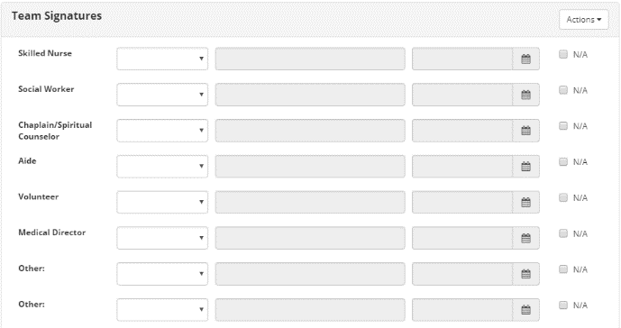 Additionally, when multiple clinicians are selected in the Team Signatures section of a document (e.g. IDT Meeting ), shown in the fourth sample image, this enables the corresponding users to sign the document electronically using existing functionality in the Documents screen. The last team member to sign will then click