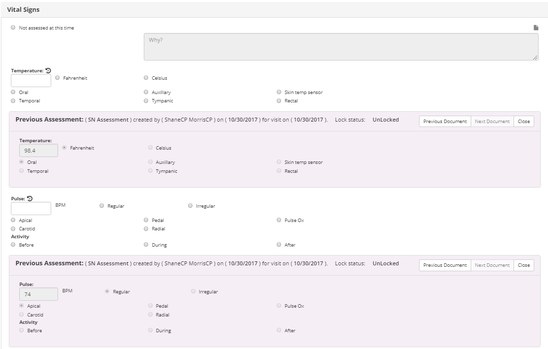 next to a field of data, a shaded Previous Assessment section displays directly below the corresponding field. This section contains any data that was entered in this field in the last document. Users can also display data for other documents (if applicable) by using the Previous Document and/or Next Document buttons. Additionally, the following information associated with the previous document displays in the section header: Name of the document, user that completed the document, date of completion, visit date, and the lock status.