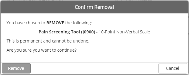 The remove section option is labeled according to the section (e.g. "Remove Pain Screening Tool (J0900) – 10-Point Non-Verbal Scale"). After the Confirm Removal prompt displays, click Remove.