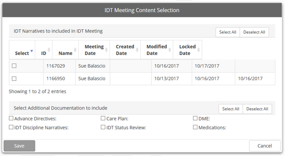 IDT Meeting documents do not need to be saved. Each entry is saved once the cursor leaves the field and moves on to the next field. To be sure to save narratives, always tab out of the narrative field. This will ensure that the narrative text is saved. |