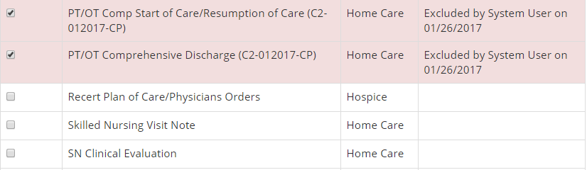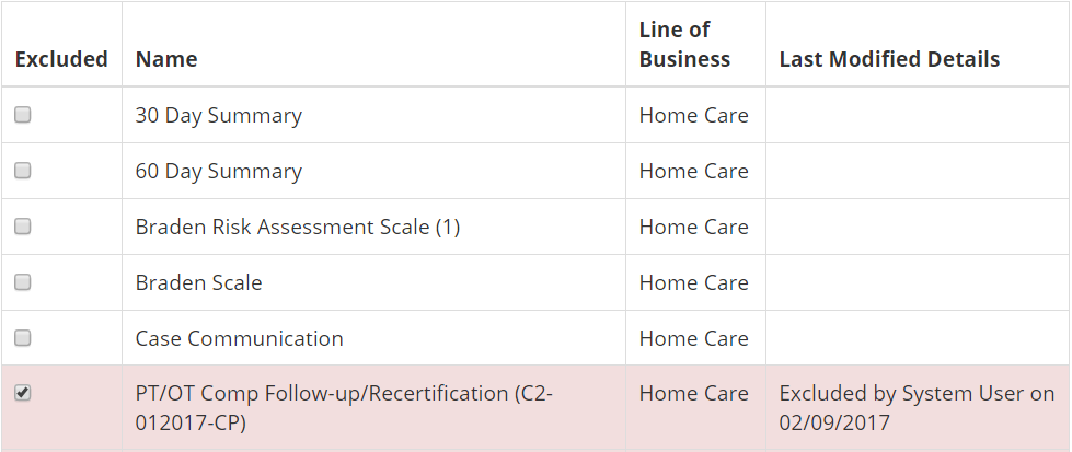 As part of the Care Planning feature in Enterprise Edition, the Document Exclusion area provides agencies with the ability to control which documents are available for users. This allows agencies to eliminate unnecessary documents from being included in the document list. For instance, if there are no patients that require occupational therapy then you can choose to exclude OT documents from the list of available documents.